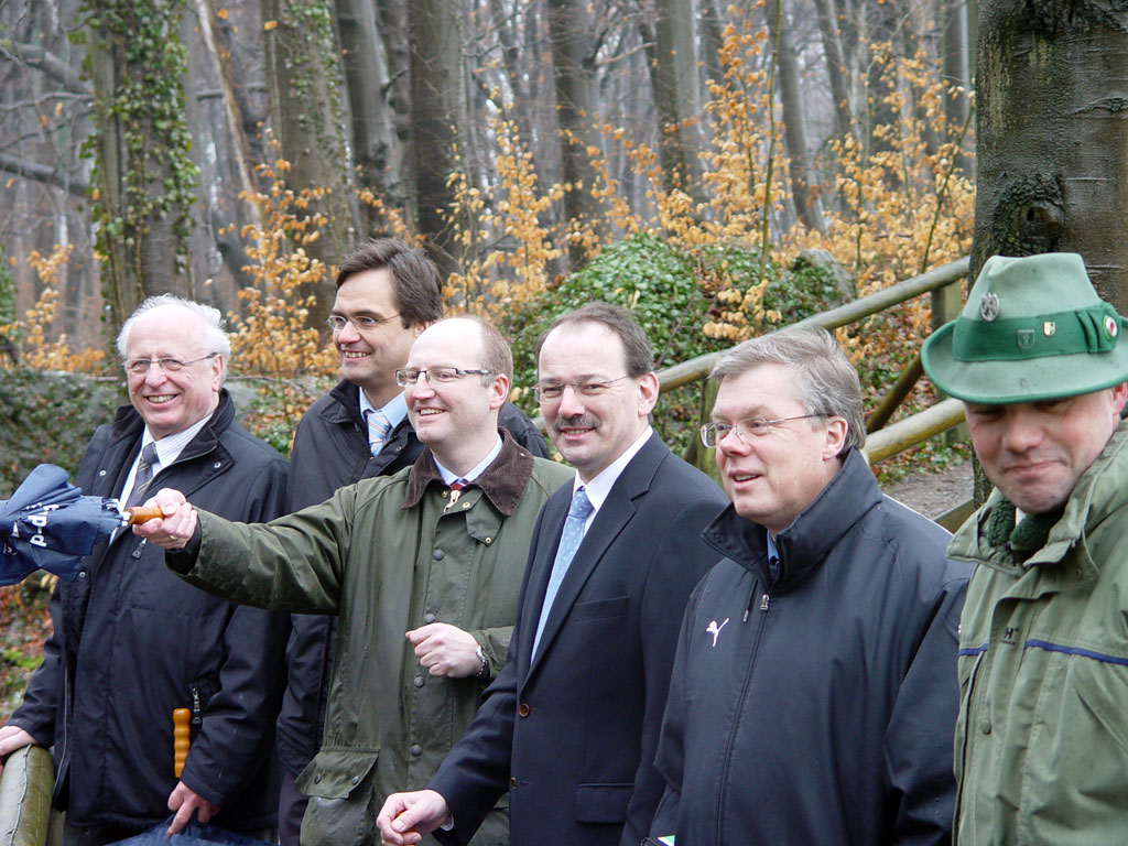 Ein Bild vom Stand der Aufarbeitung der Kyrill-Schäden machte sich der nordrhein-westfälische Landwirtschaftsminister Eckhard Uhlenberg auf dem Hof von Clemens Gödde in Balve - Benkamp. In Begleitung von MdL Hubert Schulte und dem stellvertretenden Landrat Thomas Gemke wurden zunächst der Wald und die Wege in Augenschein genommen. Während des anschließenden Gespräches mit den Waldbauern machte der Minister noch einmal auf die Fördermöglichkeiten seitens des Landes und der EU aufmerksam und riet dazu, nun zügig Entscheidungen zur Aufforstung zu treffen.