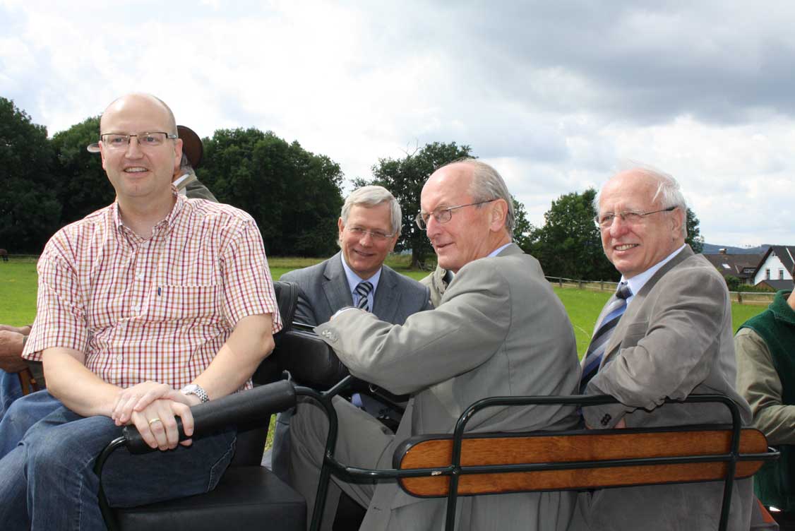 Von der erfolgreichen Umsetzung des ehemaligen Standortübungsplatzes Hemer-Apricke zum Naturschutz- und Naherholungsgebiet überzeugten sich Minister Eckhard Uhlenberg, Landtagsabgeordneter Hubert Schulte, Bürgermeister Michael Esken, der Präsident der NRW Stiftung Jochen Borchert und weitere Interessierte. Das 172 Hektar große Gebiet das schon zum Teil von verschiedenen Tieren wie Heckrinder, Wildpferde, Ziegen und Schafen beweidet wird und sein fast 15 Kilometer langer Rundweg wurden mit einer Kutschfahrt bei schönem Sommerwetter erkundet.